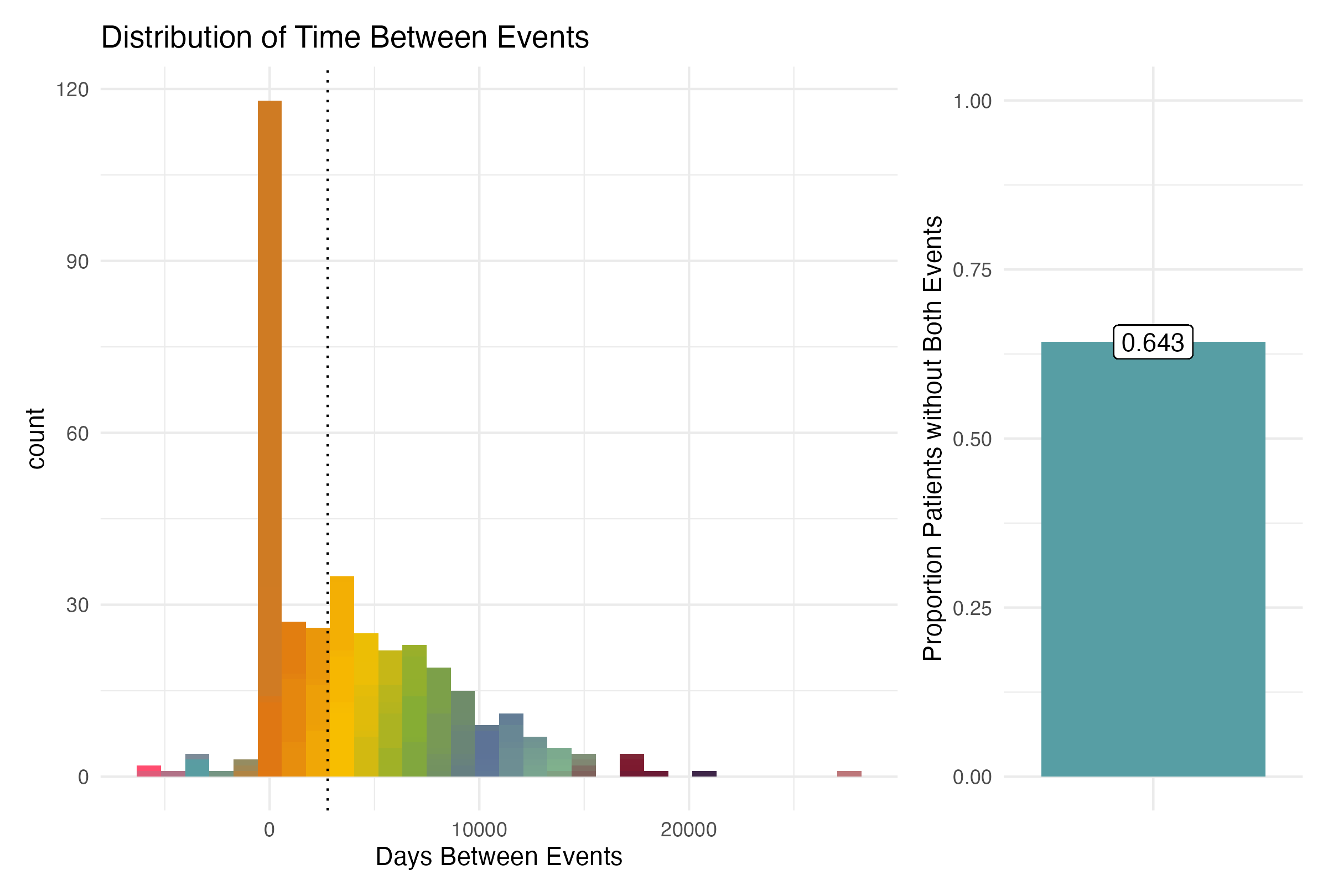 - A histogram displaying the distribution of days between events for the cohort, with a single bar graph (patchworked together with the histogram) displaying the proportion of patients who did not have Event B at all. The binsize (bar width) is automatically determined by the geom_histogram function.