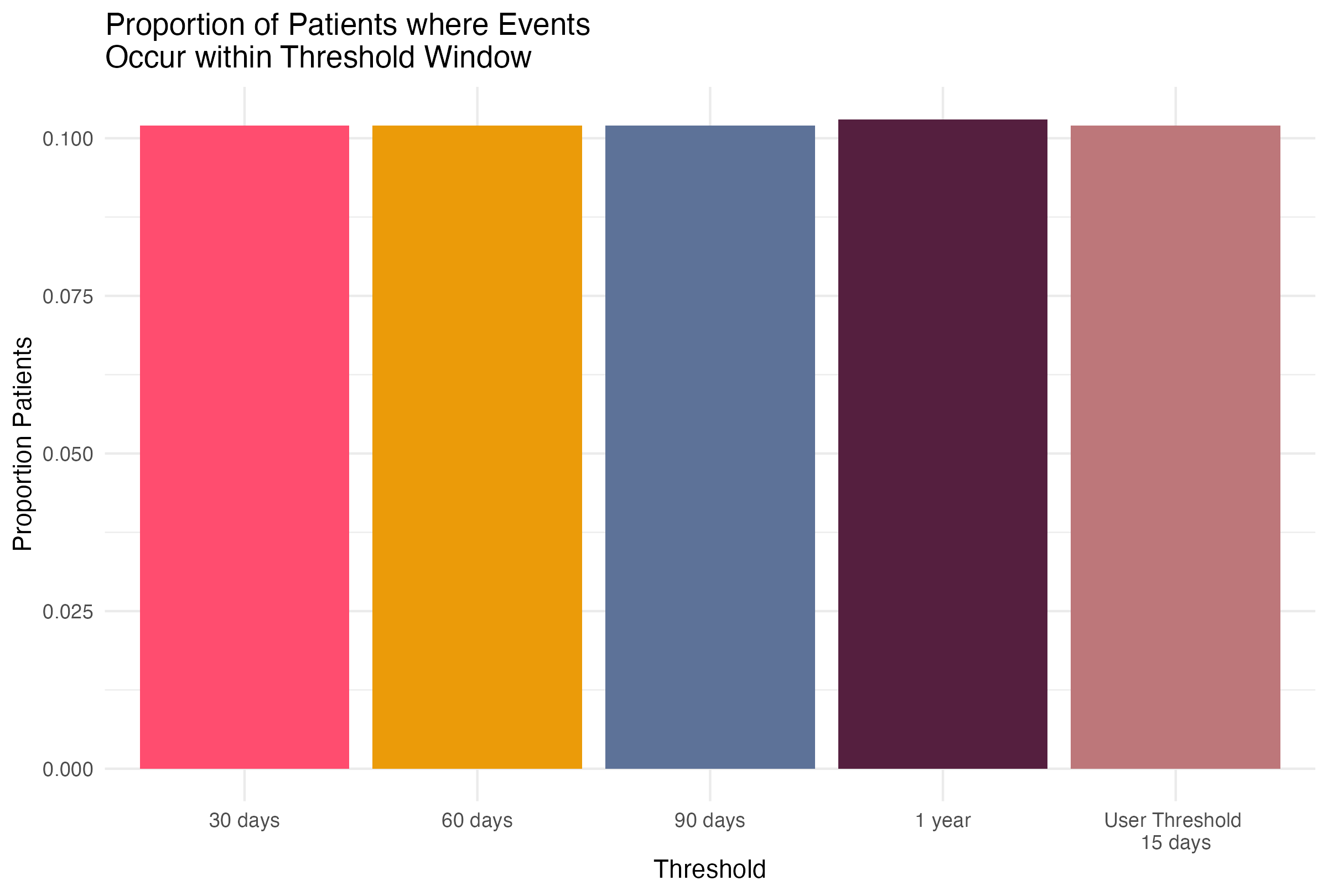 - A bar graph displaying the proportion of patients whose time between events falls within each threshold window: 30, 60, 90, and 365 days, plus a user provided threshold. These are NOT currently mutually exclusive, meaning the year bar also contains patients from all the other bars.