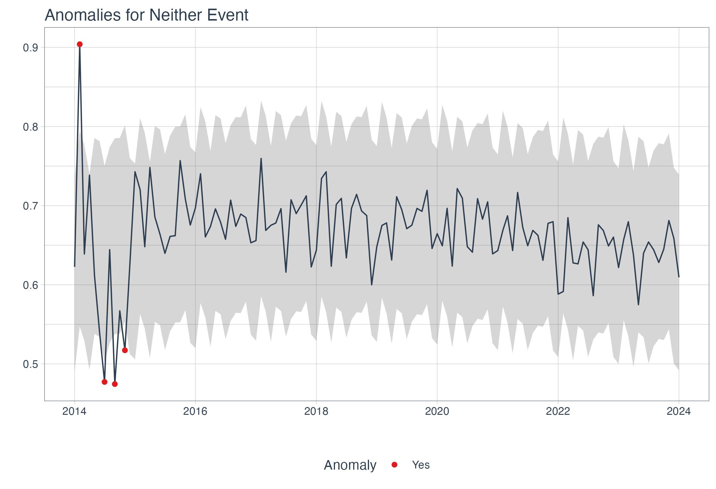 For smaller time increments (by month or smaller), seasonality can make it difficult to detect true anomalies in a time series. This output computes anomalies while ignoring seasonality and outputs 2 graphs: