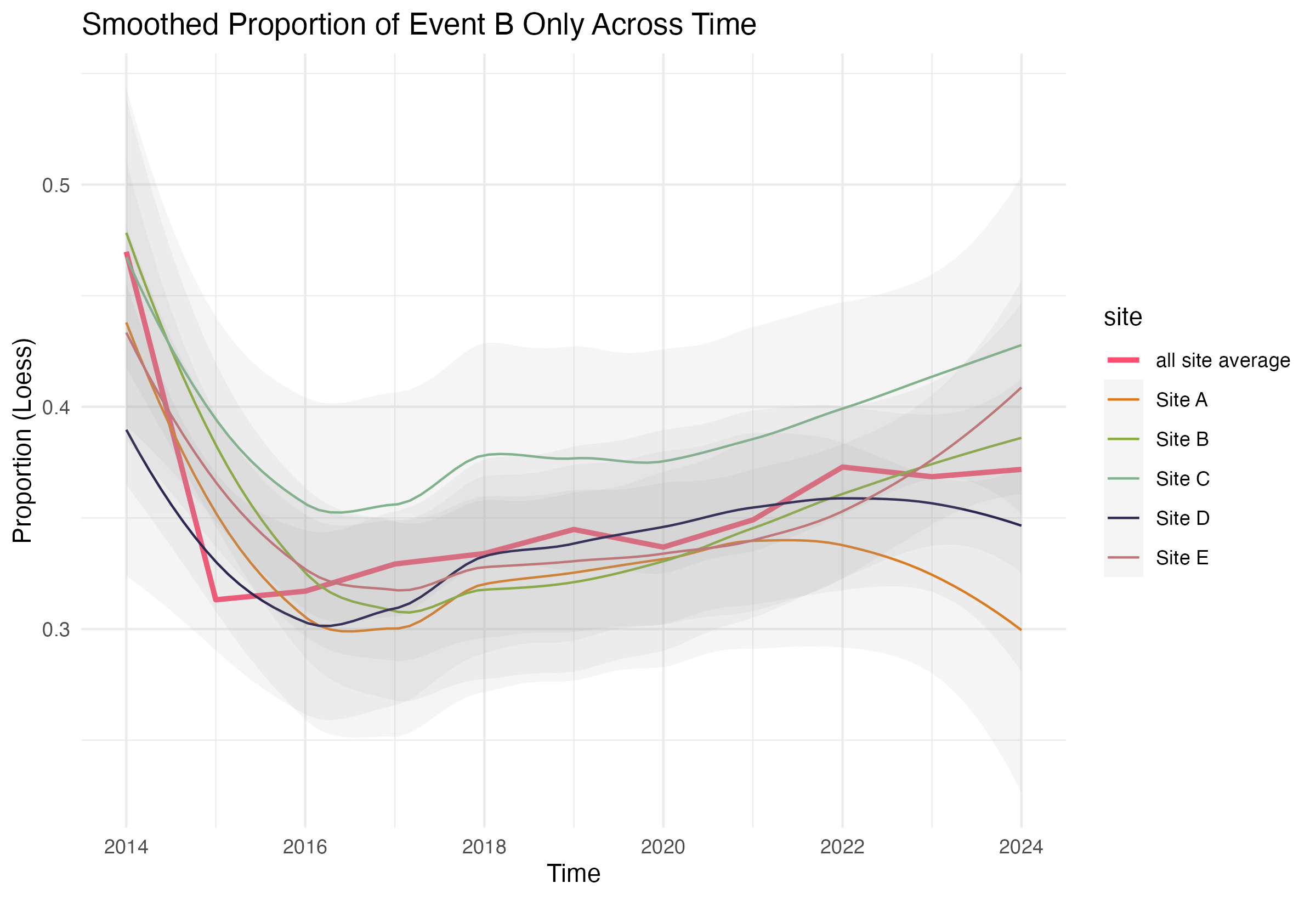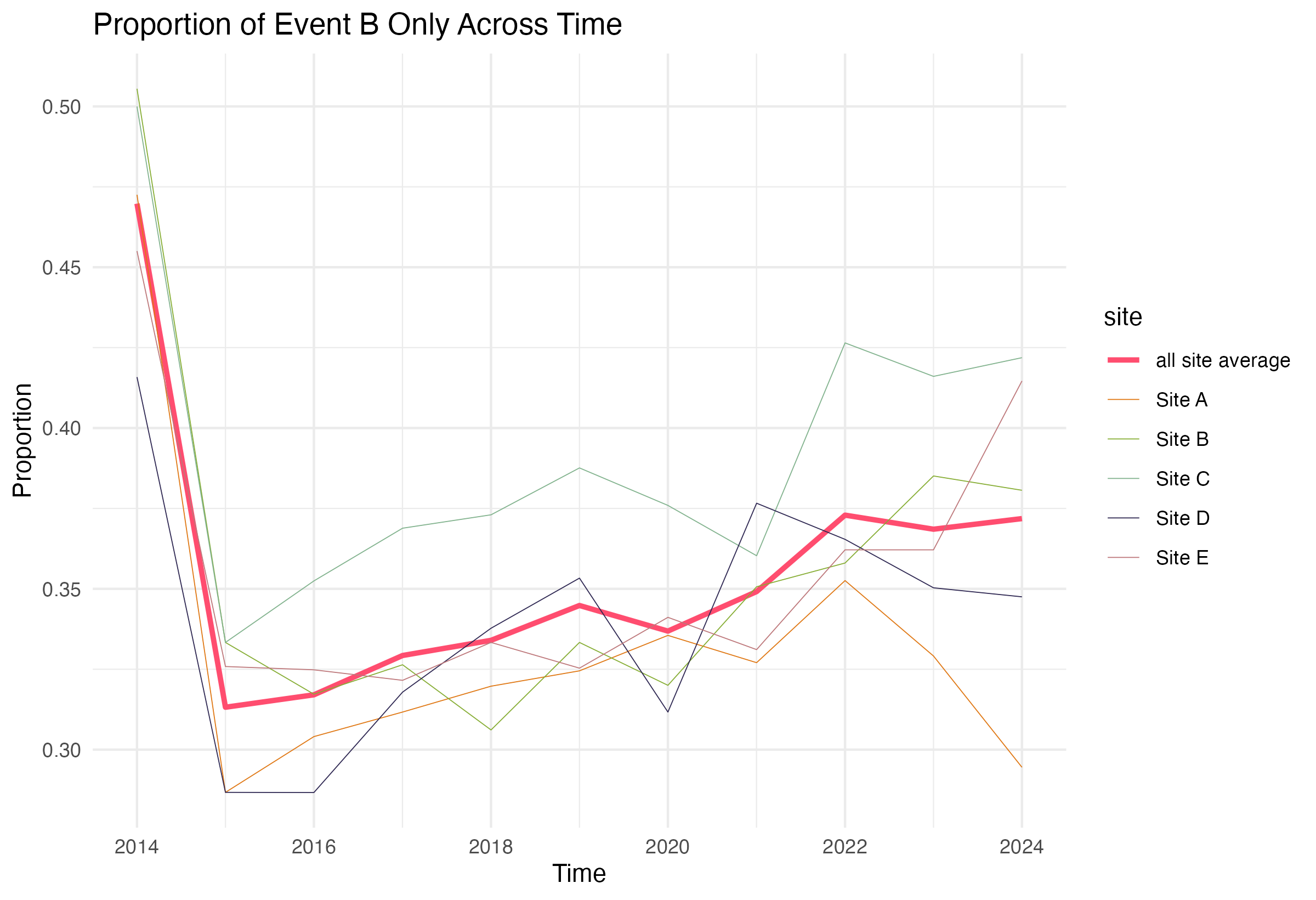 - A line graph displaying the raw (not smoothed) proportion of the event category at each site over time.