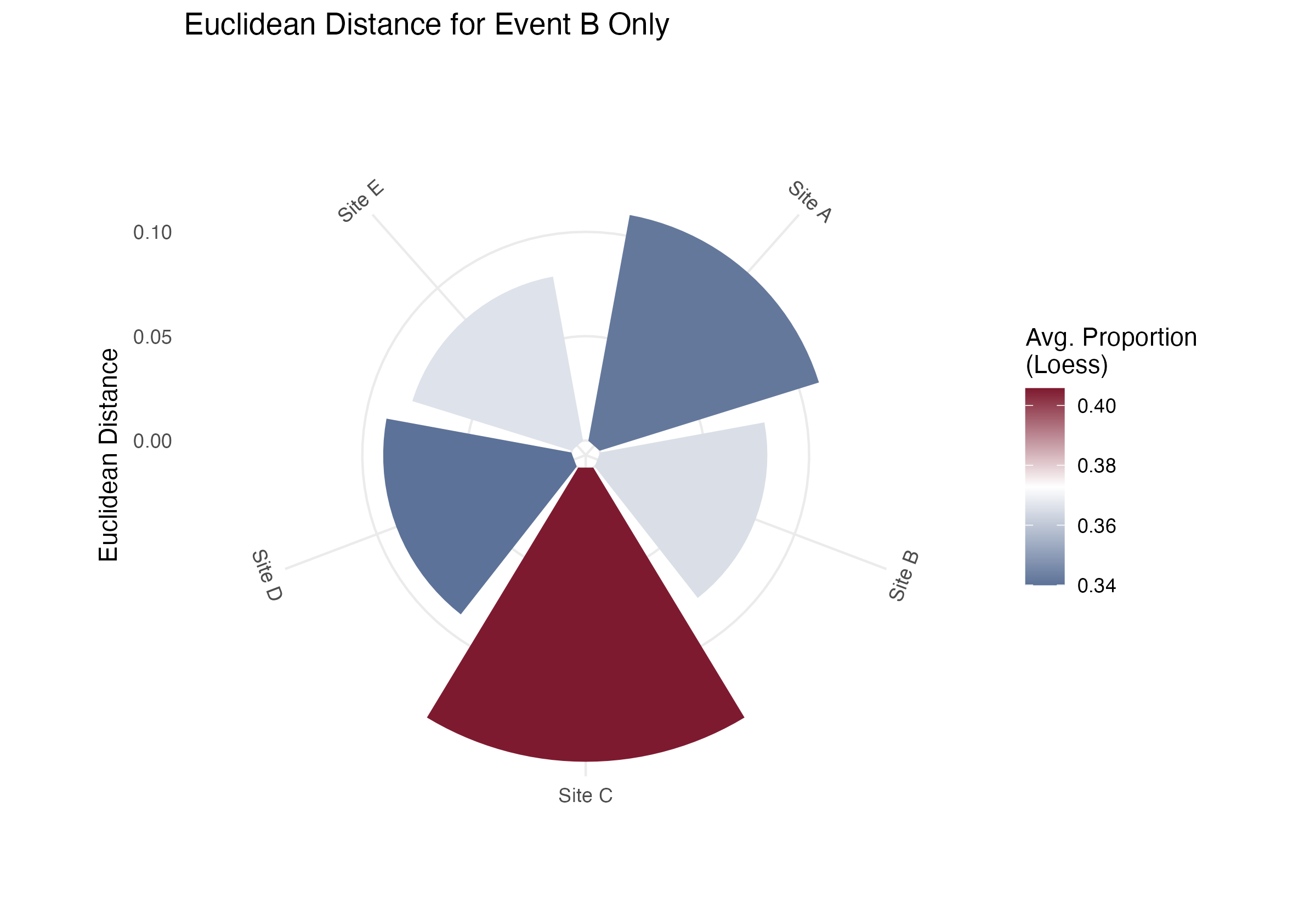 - A circular bar graph displaying the Euclidean distance from the all-site mean where the fill represents the average Loess proportion over time.