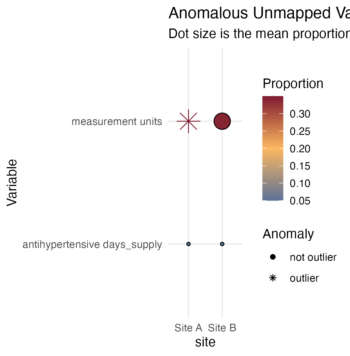This check outputs a dot plot representing anomalous proportions of patients or rows with unmapped values for a given variable per site. This graph summarizes the mean value for the variable by the dot size, the proportion of unmapped values by the dot color, and whether that variable is anomalous by replacing the dot with a star. A tooltip provides metadata for the variable and the site and precise values for proportion, mean proportion, median proportion, standard deviation and MAD upon hover.